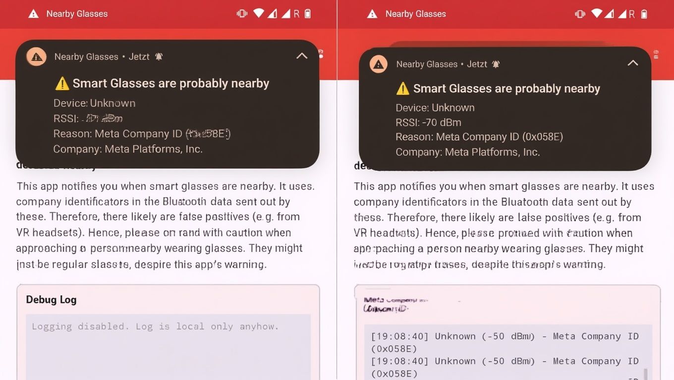 Nearby Glasses scans ambient Bluetooth signals and alerts users when someone in range is wearing camera-equipped smart glasses.