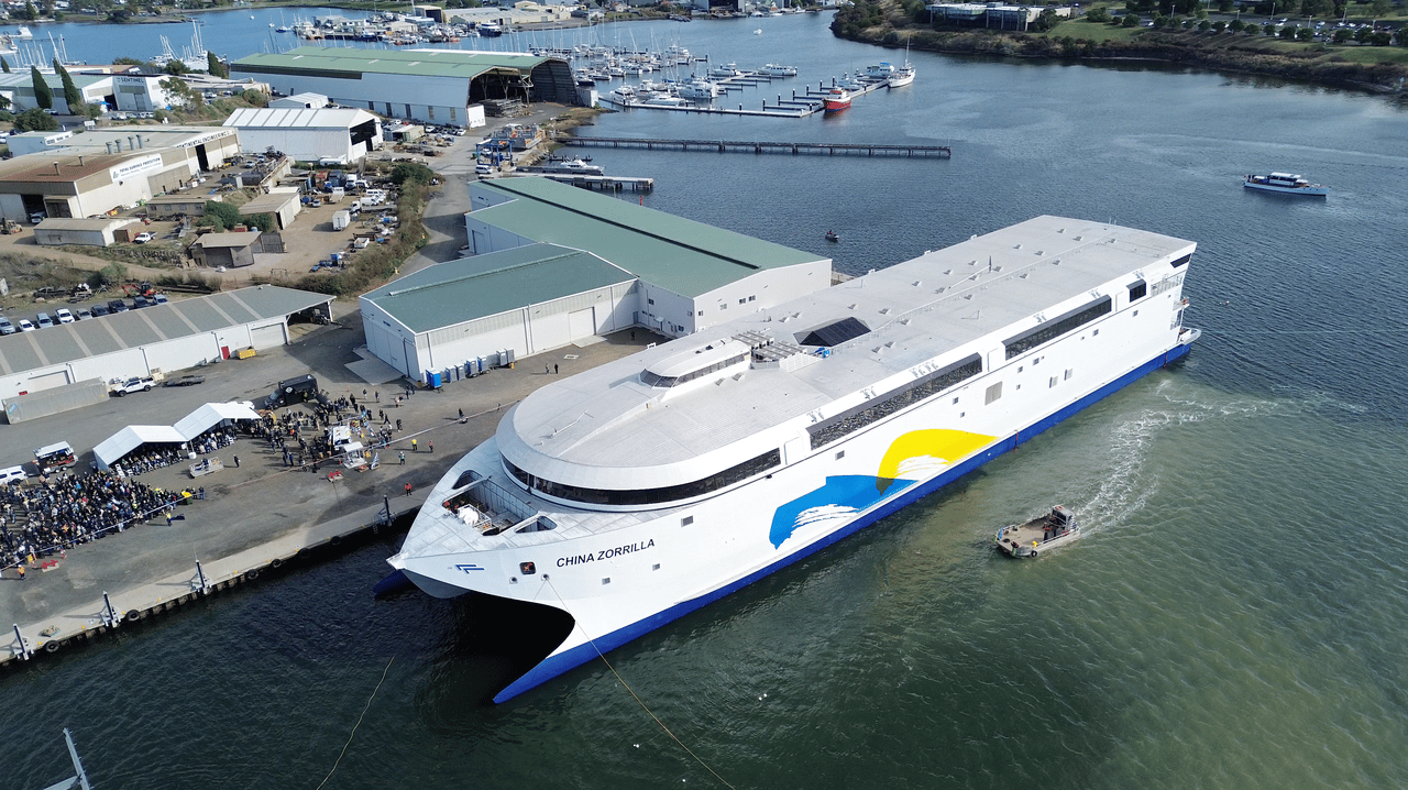 Incat just completed full deployment trials of the ship’s Marine Evacuation System, with six 22-meter MES units supported by 13 life rafts.