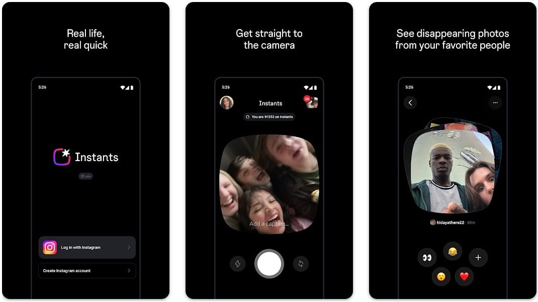 Instants lets users send single-view photos and short videos that vanish after 24 hours, with no editing beyond text overlays.