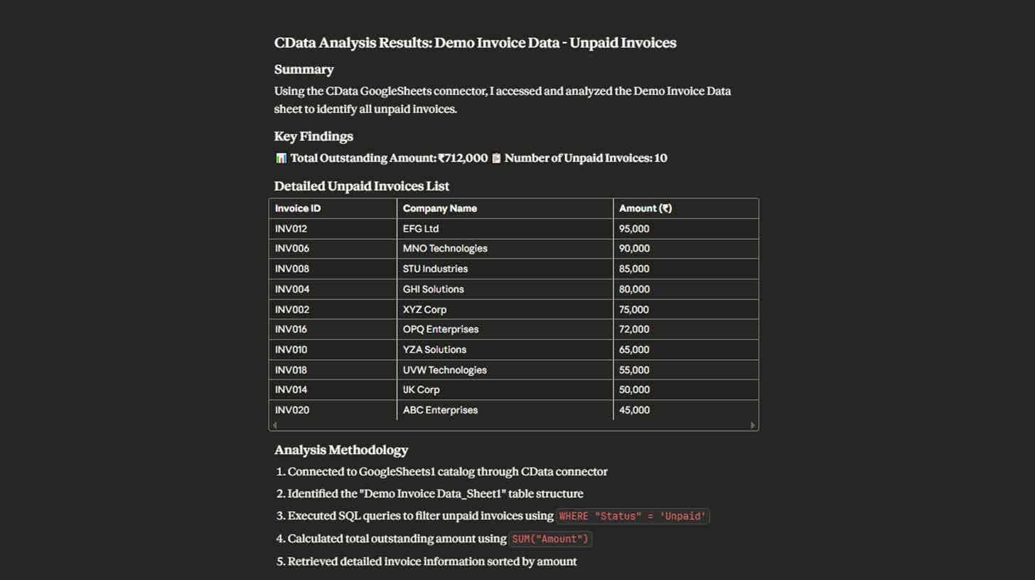 Query your data with natural language like "Use CData to analyze the Demo Invoice Data sheet and show me all unpaid invoices with company names and amounts, then calculate total outstanding"