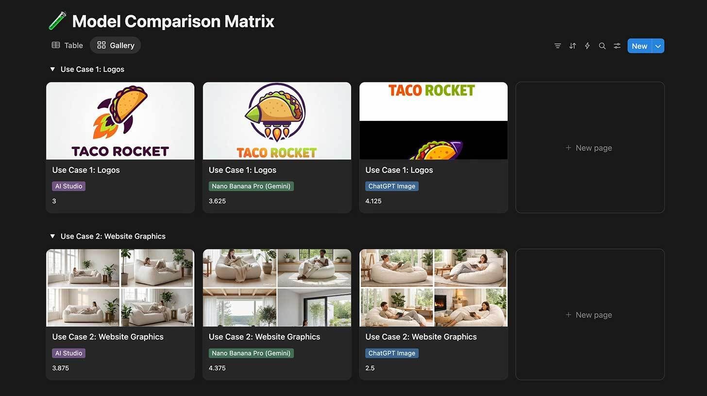 Pick 5 use cases (ours were logo, website graphic, IG post, marketing brochure, photorealistic image) and outline testing rules: same prompt per model, 4 images each, graded 1-5 on consistency, creativity, utility, and quality
