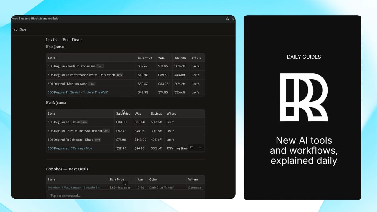 Prompt: “Find me a good deal on [item]. I prefer brands like [brands]. Start with the item type, then add brand preferences, cosmetic style, and sizing”