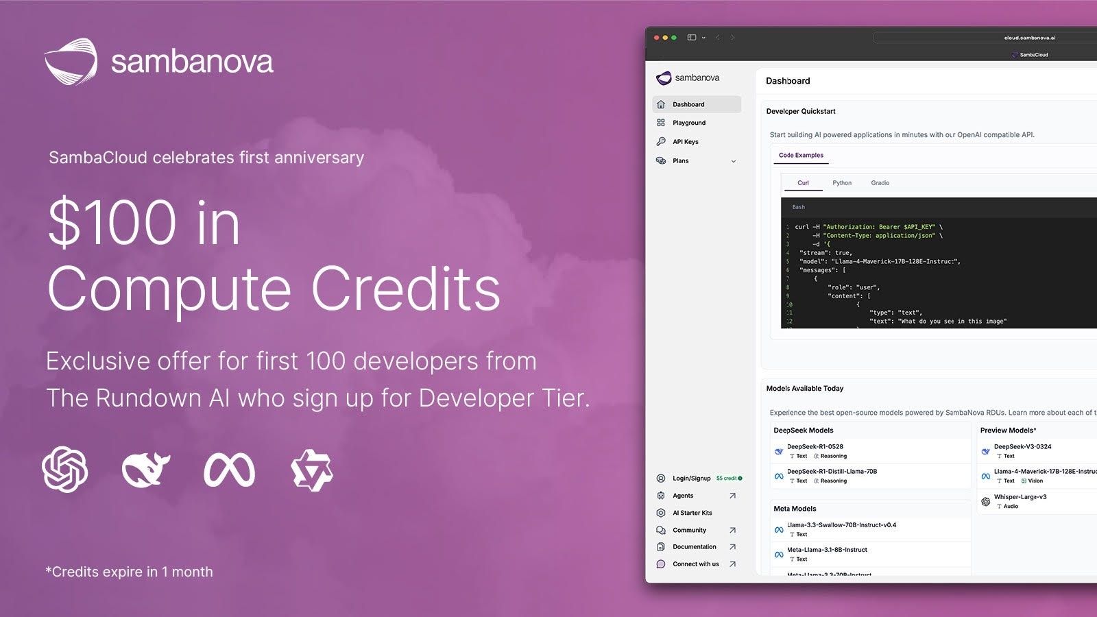 The Rundown: SambaCloud delivers lightning‑fast inference on top open‑source models using SambaNova’s purpose‑built and energy-efficient AI chip, and is offering an exclusive $100 credit to the first 100 developers who sign up through The Rundown AI for the platform’s first anniversary.
