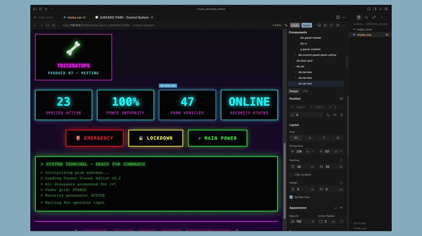 CMD+Shift+P, search "Open with Live Server," then copy the URL and paste it into Cursor browser (CMD+Shift+B)Toggle on the element selector, click any element to edit properties in the Design pane, or tell the agent what changes you want in the active chat