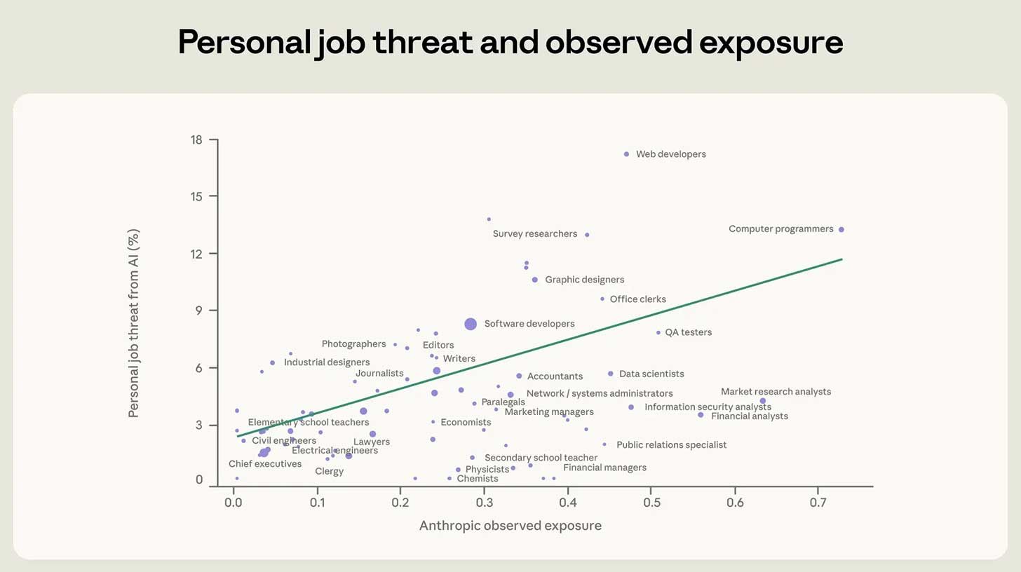 Workers whose jobs use Claude most voiced AI displacement fears, 3x more than those whose jobs use it least, with engineers leading the anxiety.