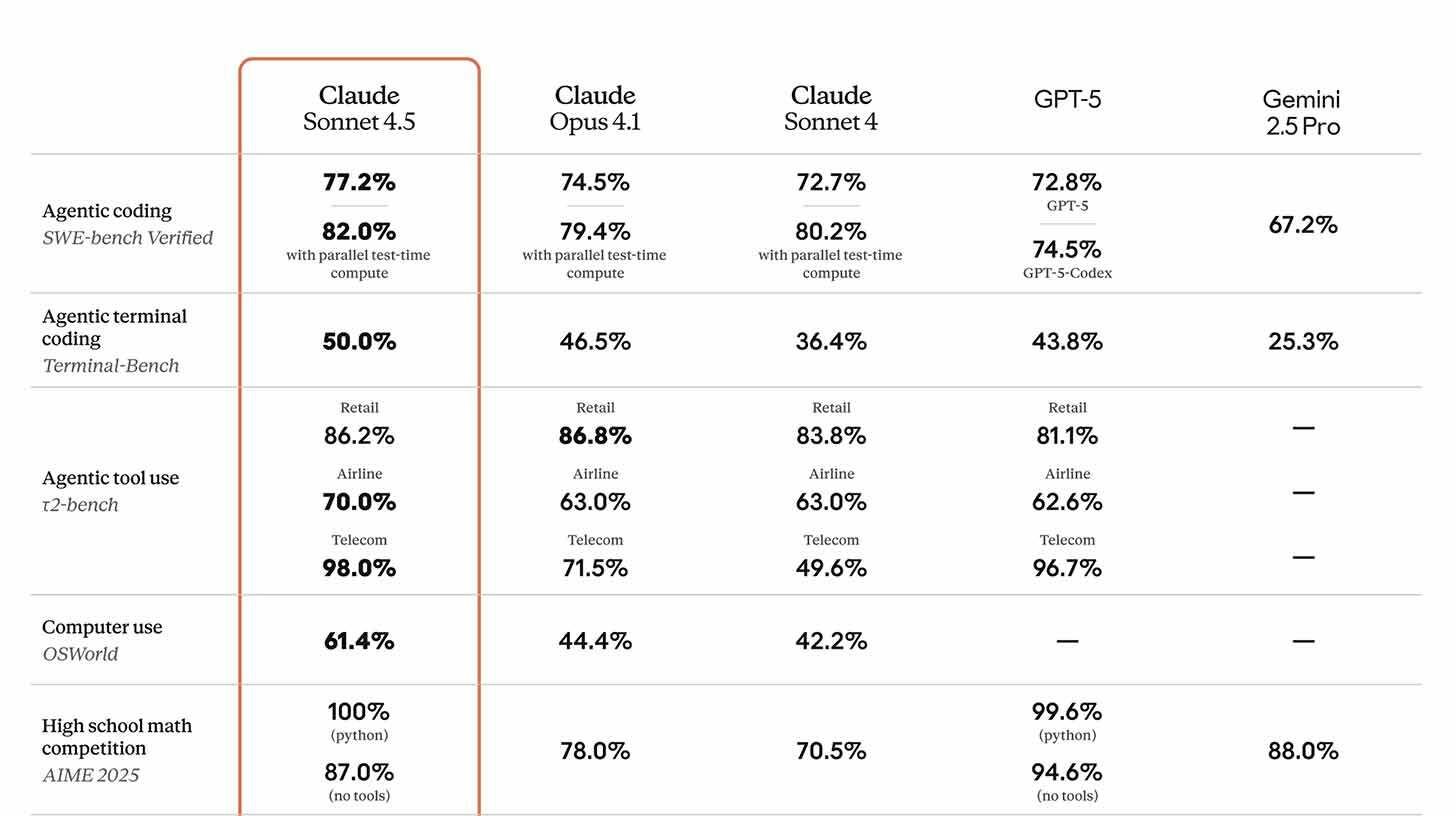 Sonnet 4.5 achieves SOTA results on real-world software development (SWE-bench verified), and a nearly 20% upgrade from Opus 4.1 on computer use.